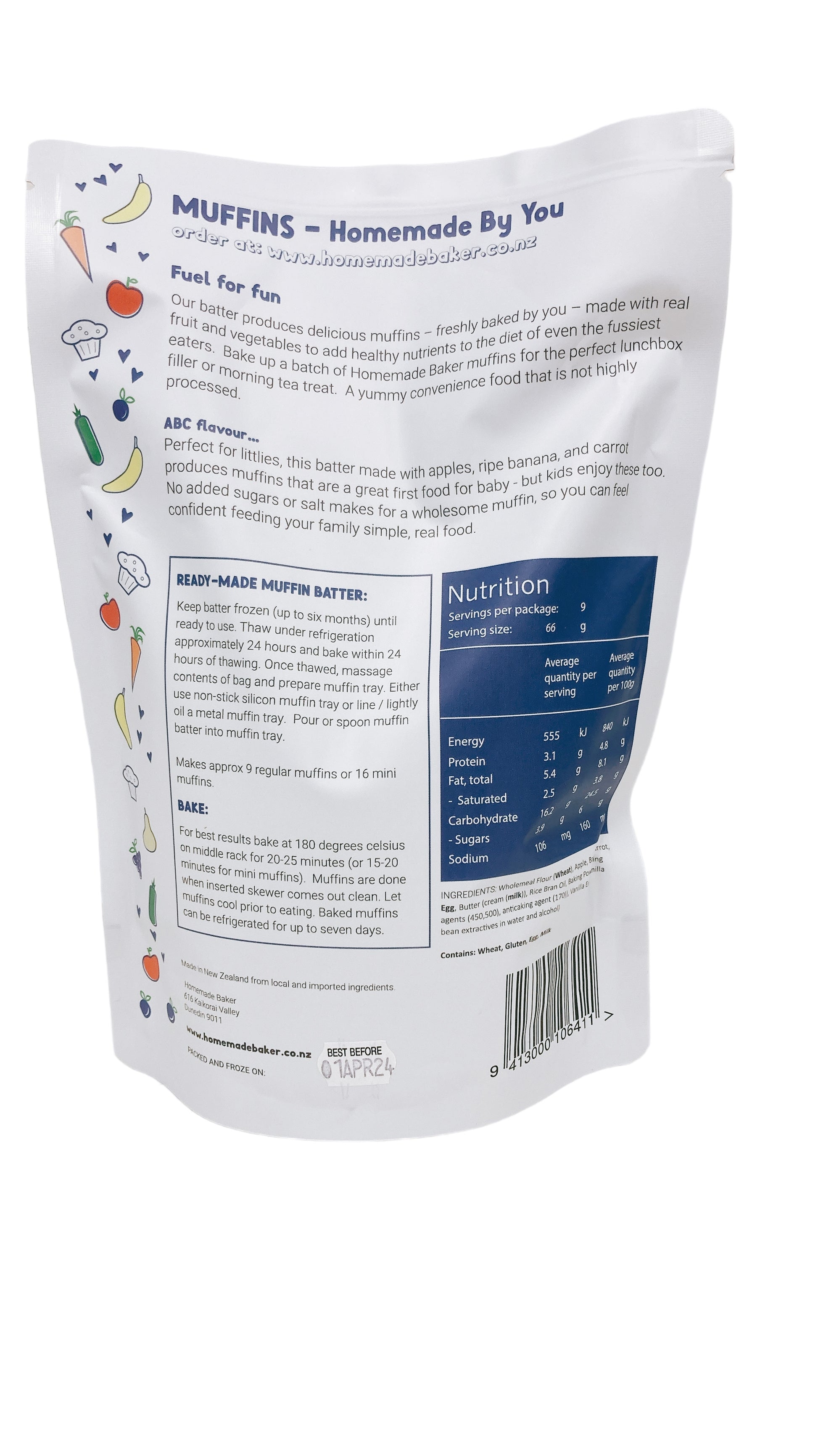 Perfect for littlies, this batter made with apples, ripe banana, and carrot produces muffins that are a great first food for baby - but kids enjoy these too. No added sugars or salt makes for a wholesome muffin so you can be confident feeding your family simple, real food.
