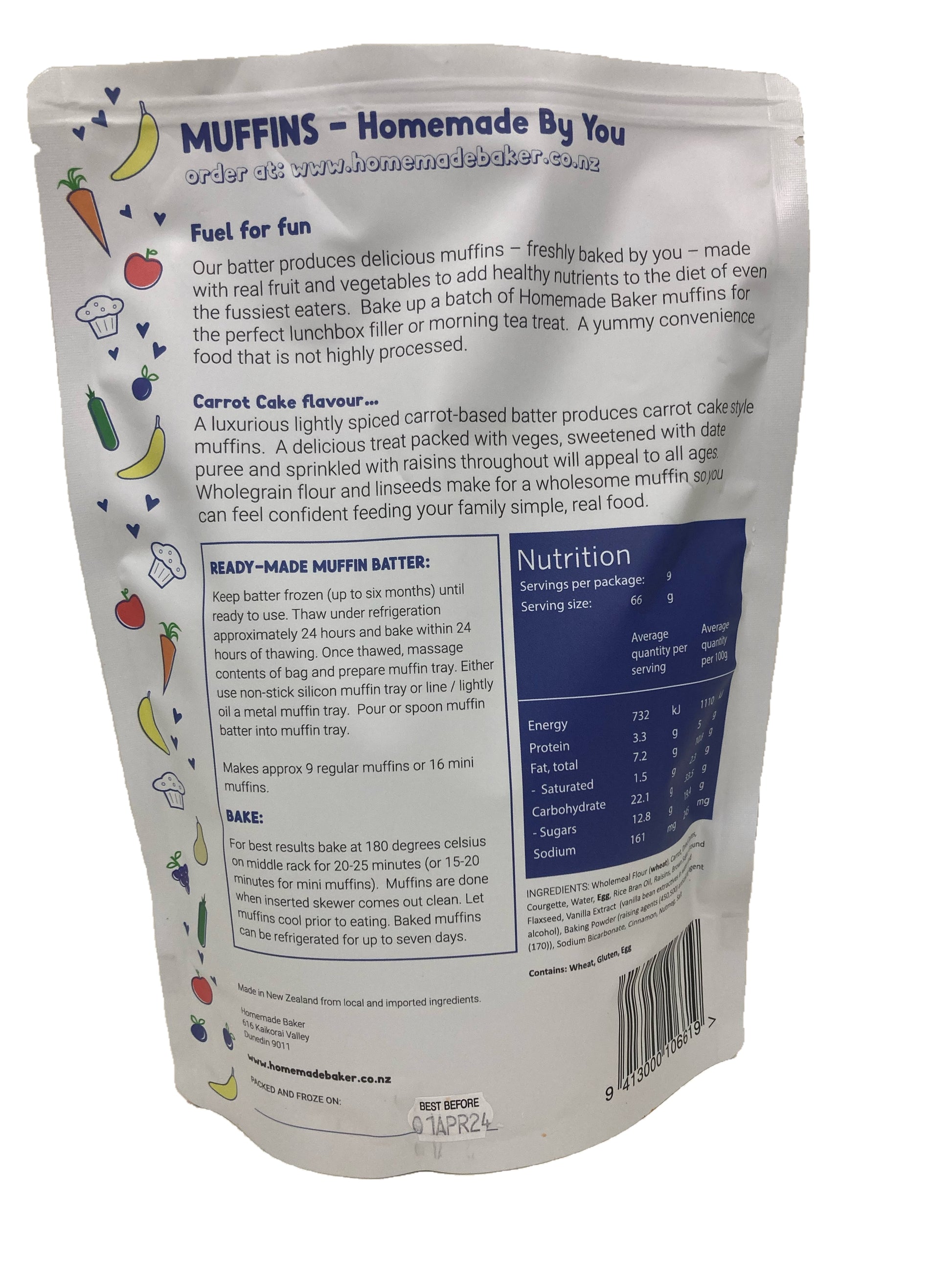 INGREDIENTS: Wholemeal Flour (wheat), Carrot, Dried Dates, Courgette, Water, Egg, Rice Bran Oil, Raisins, Brown Sugar, Ground Flaxseed, Vanilla Extract (vanilla bean extractives in water and alcohol), Baking Powder (raising agents (450,500) anticaking agent